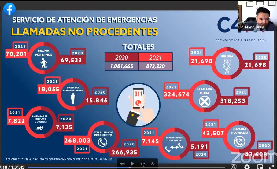 El funcionario municipal, quien se mostró incómodo y jugueteó con su sillón en todo tiempo durante las preguntas de las y los regidores, reveló que el año pasado, fueron realizadas 873 mil 220 llamadas de broma al sistema de emergencias lo que, sin embargo, representó una baja con respecto al año pasado cuando se registraron 61.44 por ciento de llamadas de broma.
