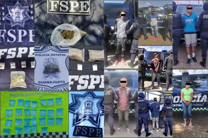 En San José Iturbide, se detuvo a un masculino en la comunidad de El Capulin con 30 dosis de marihuana; se localizaron 24 dosis de drogas sintéticas, 38 gramos de marihuana y una motocicleta con reporte de robo en Las Liebres en Romita; en la colonia Villa Hermosa en Dolores Hidalgo, se detuvo a un masculino con 50 dosis de marihuana y una motocicleta con reporte; y en Valle de Santiago, se detuvo a un elemento administrativo de Seguridad Pública con 2 armas de fuego, una de fabricación artesanal, 2 cartuchos y 6 dosis de drogas sintéticas.
