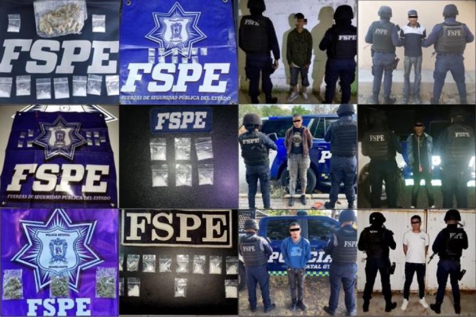 Durante un operativo realizado en la zona, en el municipio de Villagrán, se aseguró en la colonia Planetaria, a un hombre con 41 dosis de drogas sintéticas; en el fraccionamiento El Rehilete, se localizaron 65 dosis de drogas sintéticas y una motocicleta con reporte de robo; en la colonia Presidentes en Santiago Maravatío, se detuvo a un masculino con 43 dosis de drogas sintéticas; y en Jerécuaro, se aseguraron 90 dosis de marihuana a un masculino que fue puesto a disposición de la autoridad, en la colonia Los Mezquites.