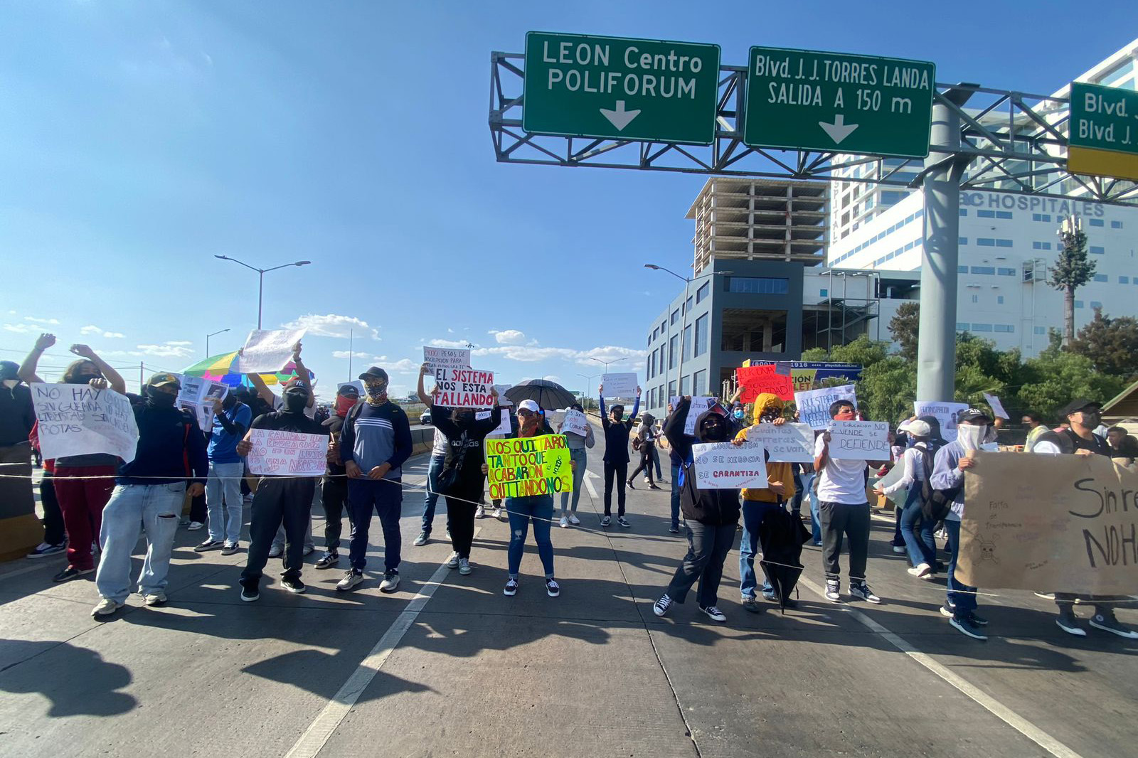León, Gto., 30 de octubre de 2025.- Estudiantes del Instituto Tecnológico de León (ITL) bloquearon este jueves casi en su totalidad, por hora y media, el bulevar Aeropuerto a la altura del Distribuidor Vial Juan Pablo II.